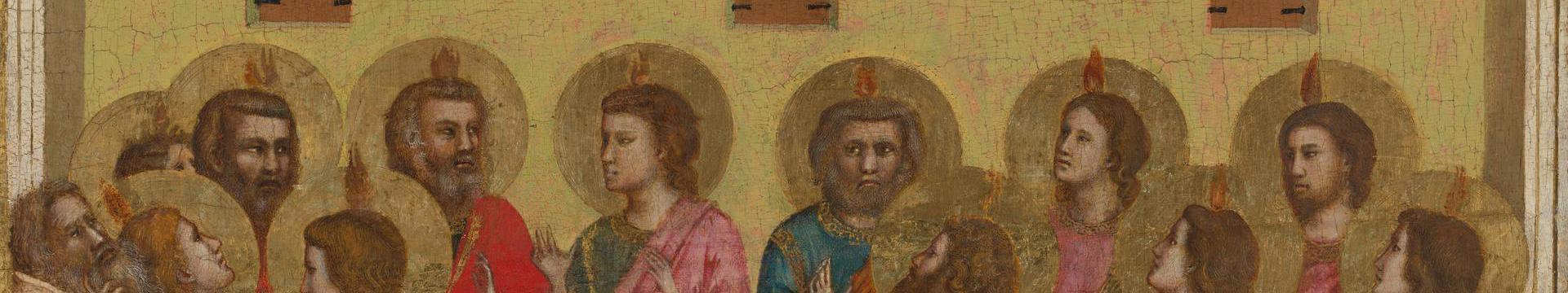 This room contains the earliest paintings in the National Gallery Collection. They were made in central Italy nearly 800 years ago. These naturalistic and intimate images of love, grief and suffering responded to a new interest in the humanity of Christ. This emphasis on emotional connection with Christ emerged among communities like the Franciscan Order. Their church at Assisi became a centre for the exchange of ideas between leading painters of the day, including Cimabue and Giotto.